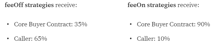 Revenue split: The revenue split between the Caller and CORE Buyer Contract is dependant on the strategy utilizing feeOff or feeOn.