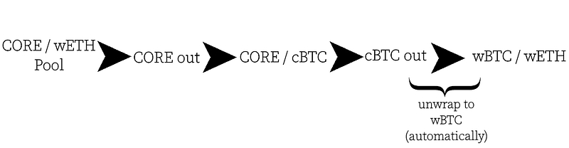 This closes the loop by itself, no need to input CORE/wETH again since the last pair will be treated as a return pair. The controller detects if cBTC is used and sets the support automatically. It makes sure the Executor picks the correct branch to execute and save gas in case support for cBTC is not on.