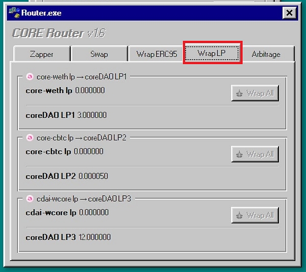 Once the Router window is opened, click on the Wrap LP tab. You will see three different sections, displaying each of the former LP tokens. If your wallet holds any of these tokens, you will be able to click the Wrap All button. Confirm the transaction and give the interface up to a minute to catch up.Congrats, you have successfully converted your LP tokens to coreDAO Voucher LP. You are ready for the migration to coreDAO tokens which will have increased utility in the CORE ecosystem.